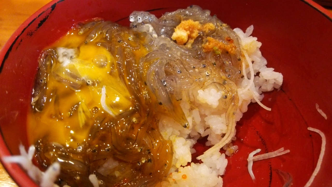 3色のうち、生シラスを醤油で漬けた沖漬けが僕的にはツボで、うずら卵の黄身を絡め、ご飯と一緒にかきこむと、何とも言えない美味しさでした。