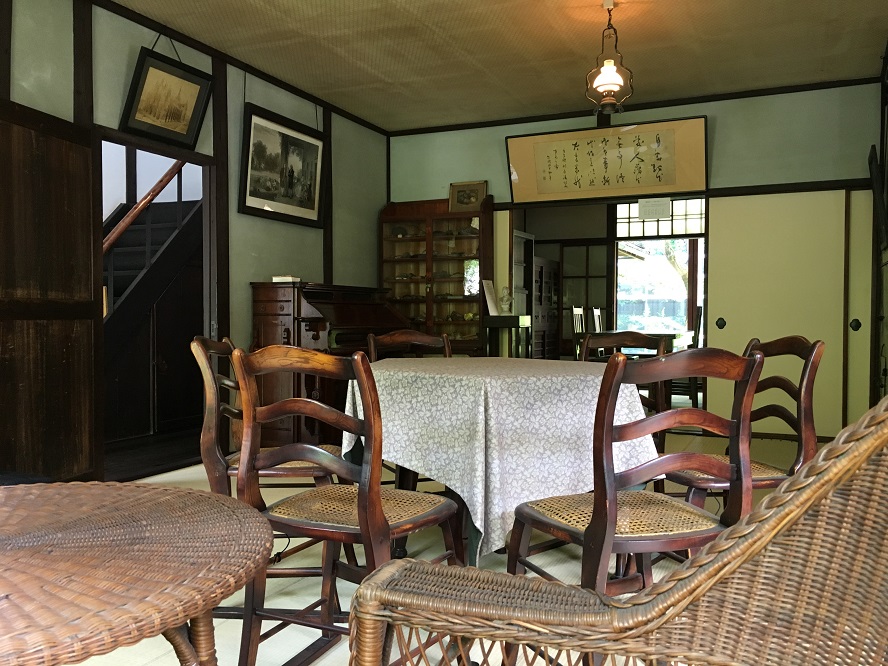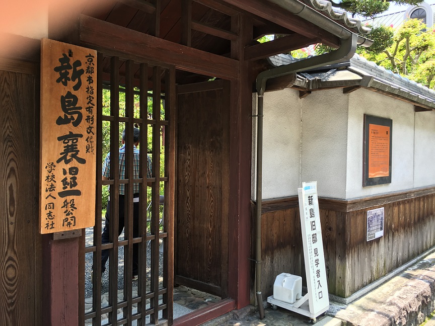 今日は「新島旧邸」にきました。寺町通を丸太町通から少し上がった荒天神口にあります。同志社大学の施設の隣にあり同志社大創設者・新島嬢と妻・八重の邸宅です。大河ドラマで新島八重の生涯を描く「八重の桜」が放送され見学者が殺到したようです。旧邸の正面は日本瓦ぶきの和風門・塀等ですが、邸宅は外観はとても質素で地味な洋風造り、三方にバルコニーをめぐらし窓には幅の狭い羽根板をブラインドのように斜めに並べたもので鎧戸がついています。無料で見学できますが、開館日に注意してください。