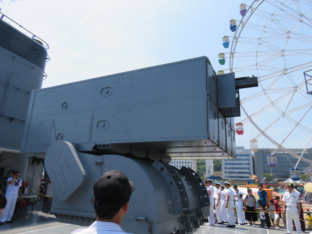 主砲の動作を見たのは初めてだ。76mm砲の砲台が全体で動いたり、砲身が上下するアクションを見せてくれた。実は、意外だったのは、砲台の動きがそれほど滑らかではなかったことだ。ただ、それでも、相当素早く動くことはわかった。さらに、対潜用のアスロックランチャーの動作と高性能20mm機関砲の素早い動作も見せてくれた。機関砲は一分間に3000発、発射と聞いた。普段は佐世保基地の所属とのこと。