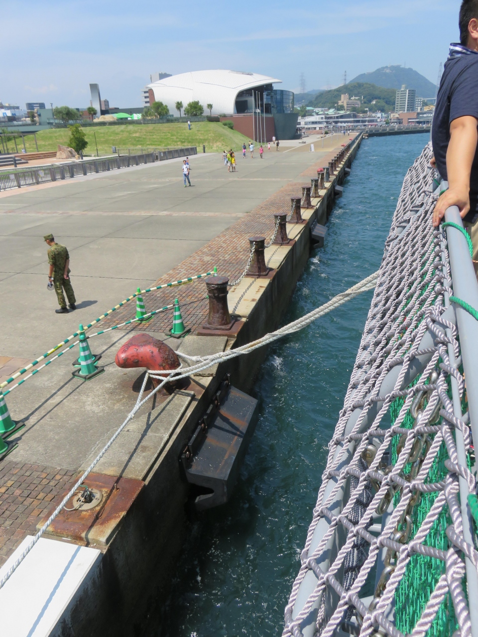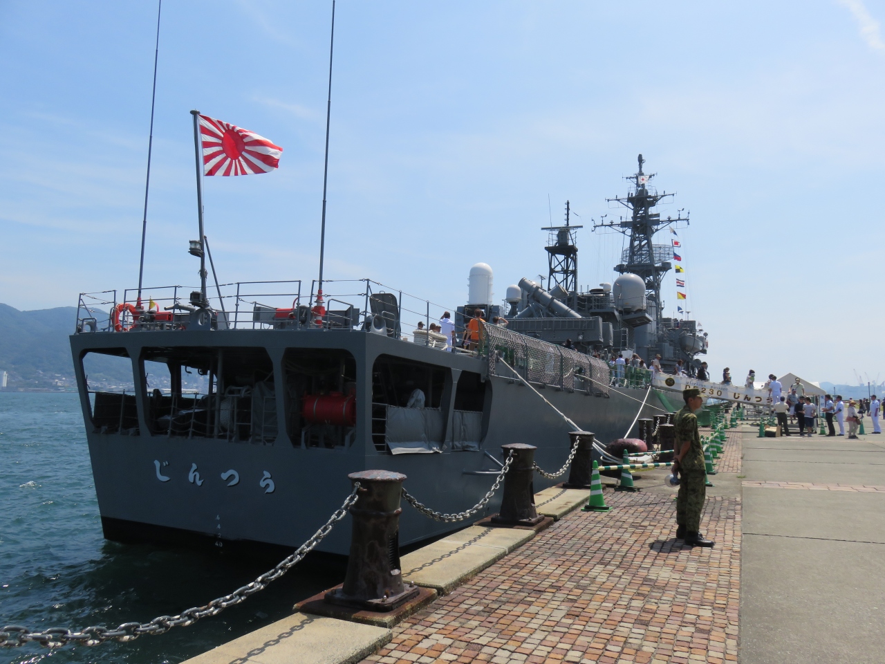 今日はサンデンバスの一日乗り放題切符(千円)を買って、下関の何カ所かを巡った。唐戸を通り過ぎると、あるかぽーとの桟橋に軍艦が横付けしており、人だかりが見えたので、急遽降りて、人の後に続いて乗艦した。護衛艦「じんつう」2000トン、長さ109mとかなり小型の護衛艦だ。二万トン近い大型の護衛艦にもここで何度か乗艦したことがあるが、その10分の1のトン数だ。