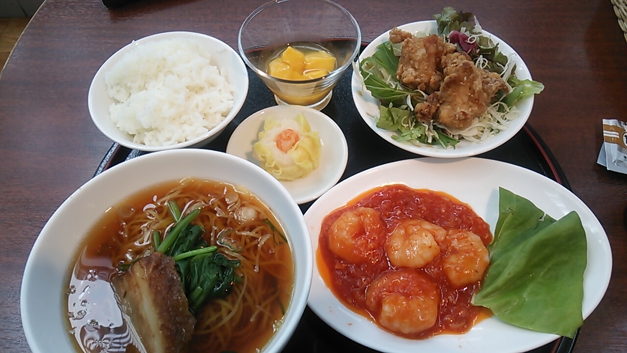 頂いたのは1食1540円する「海上楼御膳」というセットメニューで、当日はミニチャーシュー麺、海老チリ、唐揚げ、焼売、サラダ、ライス、デザートが付いてきました。