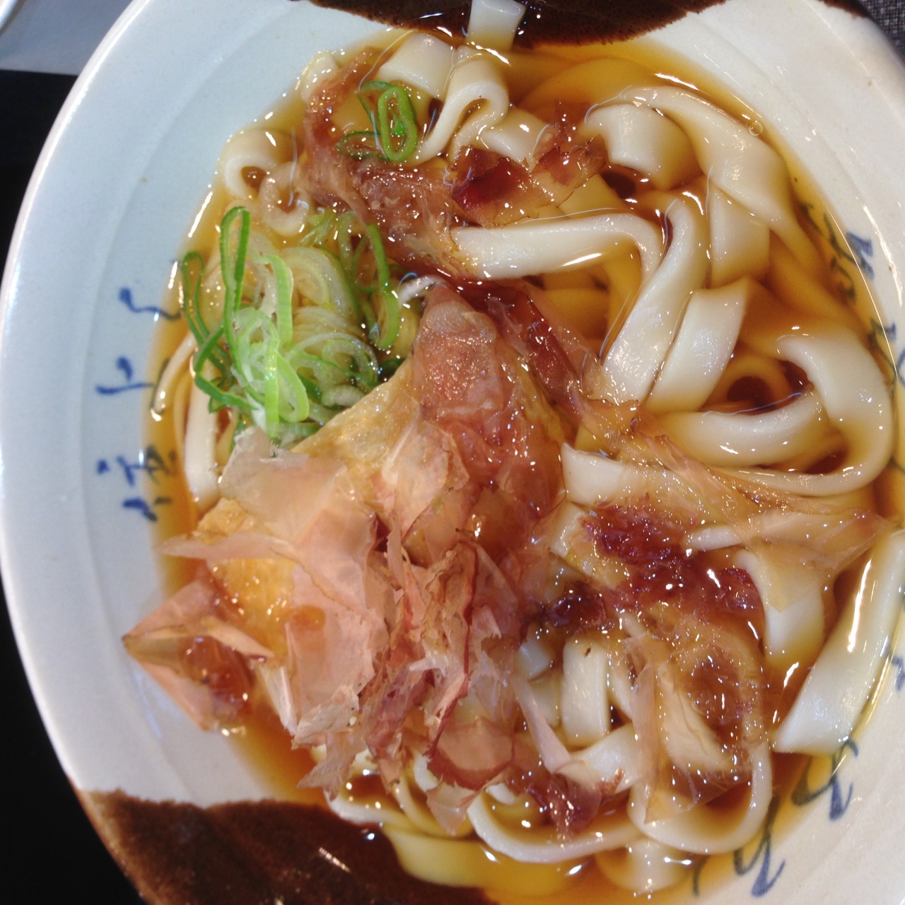 カツオダシでさらに鰹節が入っており、麺はツルツル。これなら朝早くても、飲んだ後でも食べれそう。