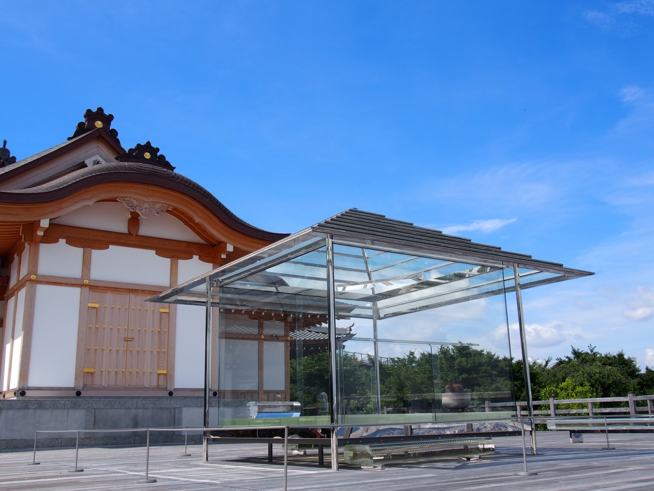 ガラスの茶室をみに行ってきました。バスも出ていますが、あまり混んでいない朝一で行きたかったのでタクシーで。何組か他に参拝客がいましたが、ほぼ貸し切り状態の大舞台は開放感があり、ガラスの茶室の写真も撮り放題。晴れていたので、京都の町並みも綺麗に見えました。