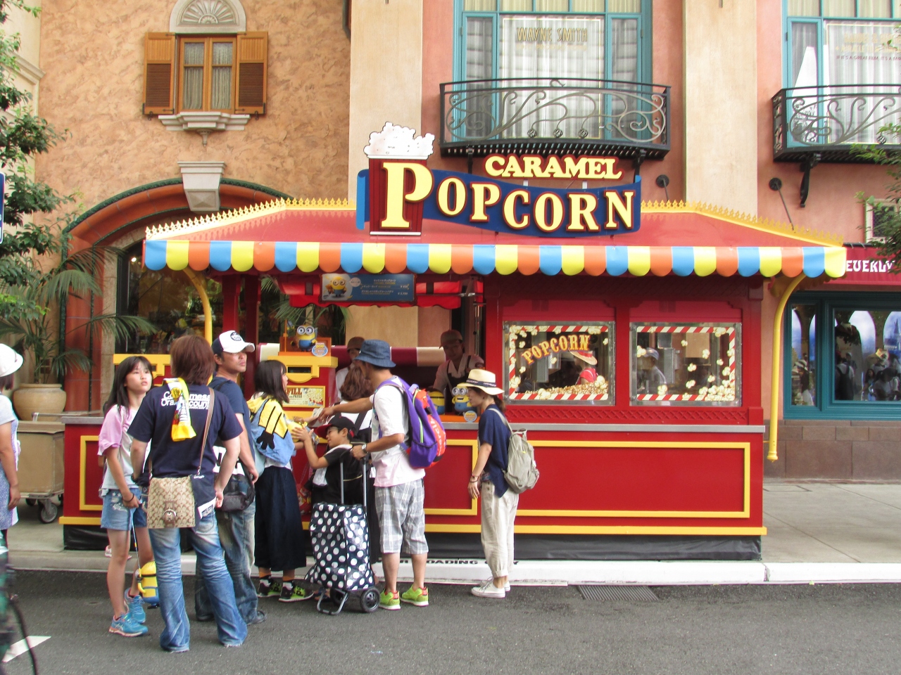 各エリアにいろんなフードカートが出ています。エントランス付近等、あちこちにあるポップコーン・ドリンク。ミニオンのおやつのカート。気軽に買えるのが魅力です。ただ現金しか使えないと思います。フードを入れるケースもかわいいものが多いです。