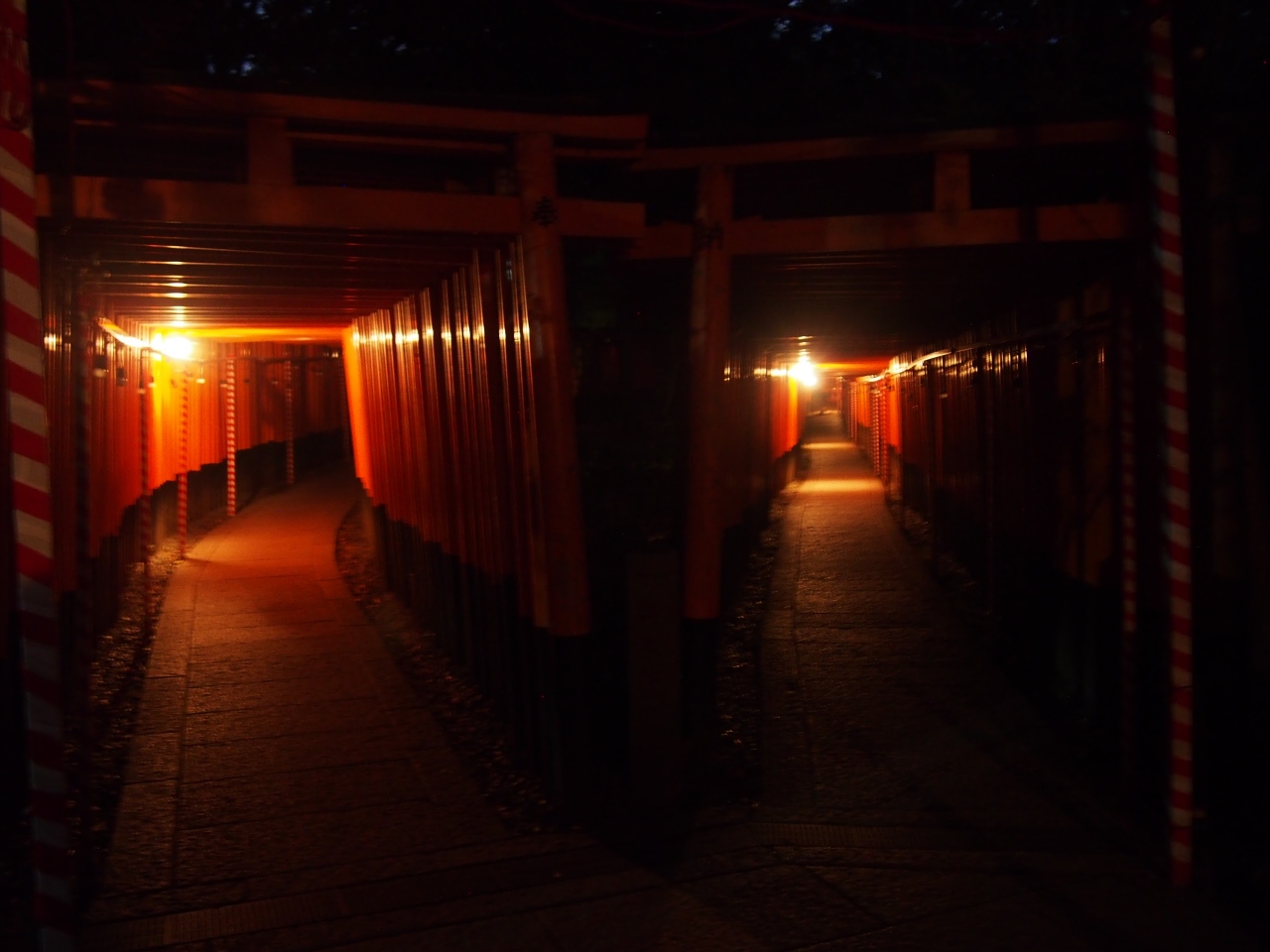早朝、稲荷山を巡り、夜に再訪しました。さすがに夜は途中で引き返しましたが朝と昼とはまったく違う印象を受けますね。観光客が多いことはうなづけますが、朝はここを走っている人も少なからずいてちょっとびっくり。