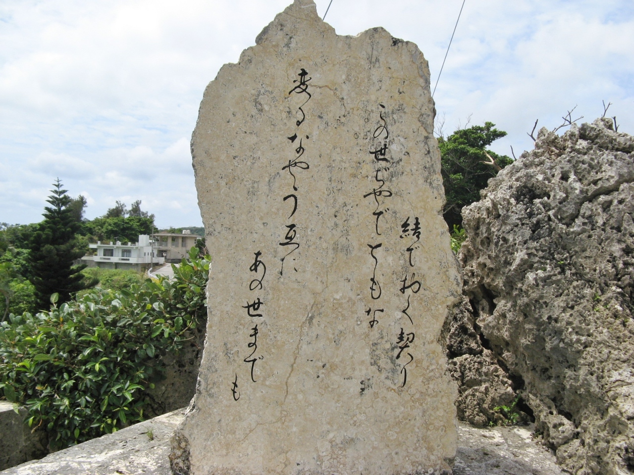 海を臨む国道沿いの高台に建てられた歌碑は立派なもので、左の歌碑には『くらさらぬ 忍で来やる 御門に出ぢめしやうれ 思ひ語ら』、右の歌碑には『結でおく契り このぢやでともな 変るなやう互に あの世までも』と刻まれています。右の歌碑は、“結んだ二人の約束は、この世のものだけと思うな、お互いに心変わりをするな、あの世までもの約束だから”という意味でしょうか、心に強く残りました。