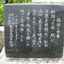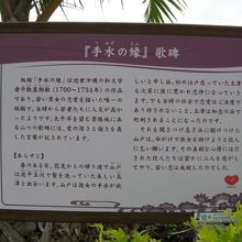 現地にある、歌碑の説明には『美しい女性に手水を乞い、飲ませてもらった男性が女性と恋におちるも、当時の社会では恋愛はご法度で、女性が処刑されそうになるが男性が助けて幸せになった。』という意味のことがかかれています。詳細は写真を添付しますので参照ください。