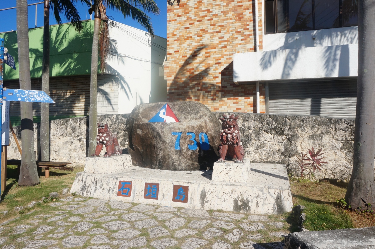 戦後、米国統治下では右側通行だったのを1夜にして左側通行へ変更した記念碑です。