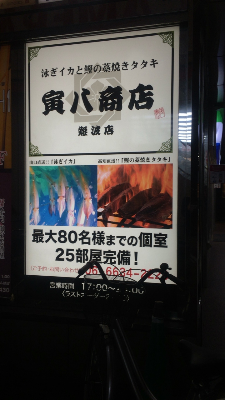 なんば千日前にある居酒屋です。土佐関連の居酒屋で海鮮料理などがメインであります。水槽もあっていかが泳いでいたり。店内はとにかく活気にあふれています。みんなでワイワイ行くには楽しいです。場所がら観光客も多い。