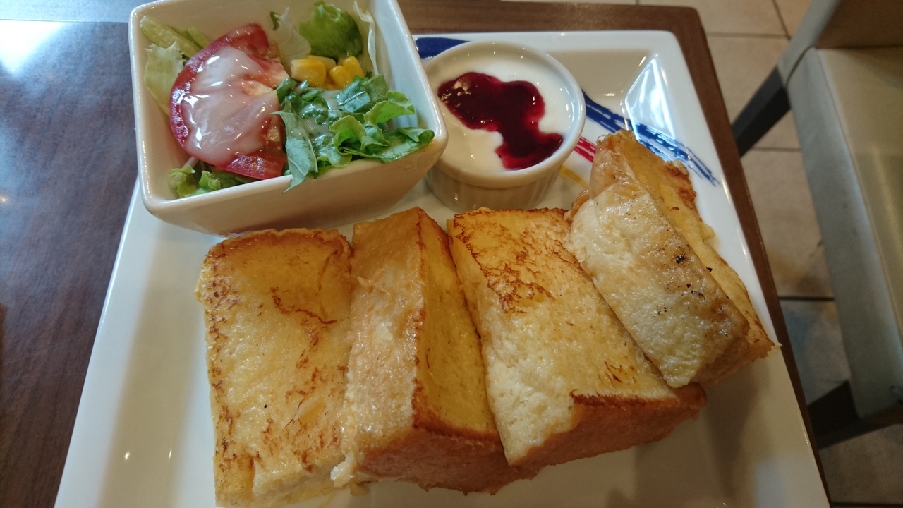 平日の10時頃来店。モーニングメニューB(フレンチトースト、サラダ、ヨーグルト、ドリンク)480円を注文。ヨーグルトはゆで卵に変更出来るとの事。