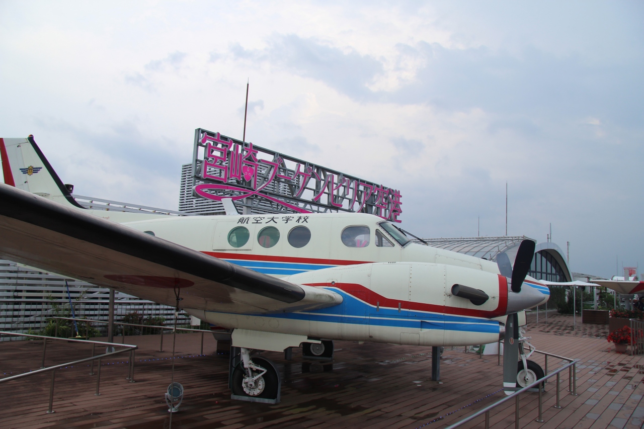 宮崎空港の展望デッキの一番奥に小型飛行機が置かれていて機内のコックピットに座ることも出来ます。但し、天井がとても低いので頭をぶつけないようにご注意ください。
