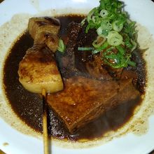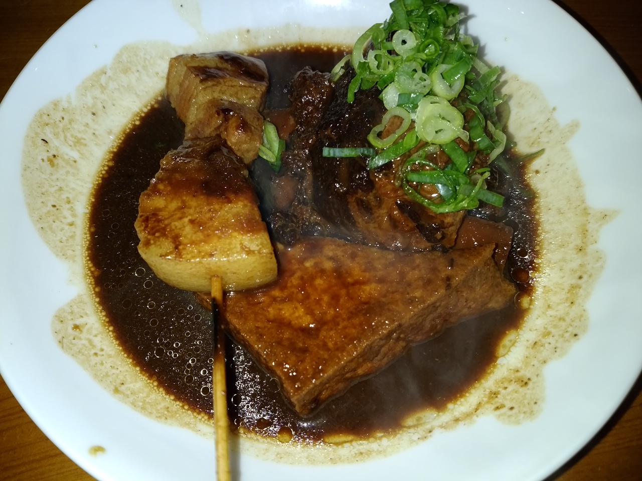 お店では鹿児島おでんを中心に鹿児島の郷土料理が提供されています。鹿児島おでんはビックリするくらい黒いので濃い味がすると最初は思いますが、食べてみると甘めの味噌味で濃い味付けではありません。