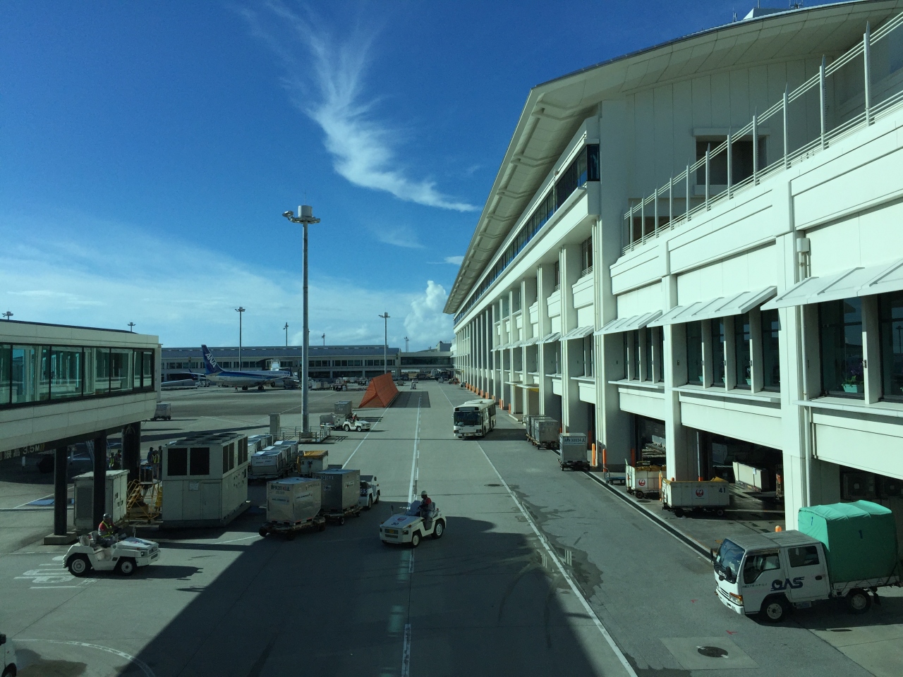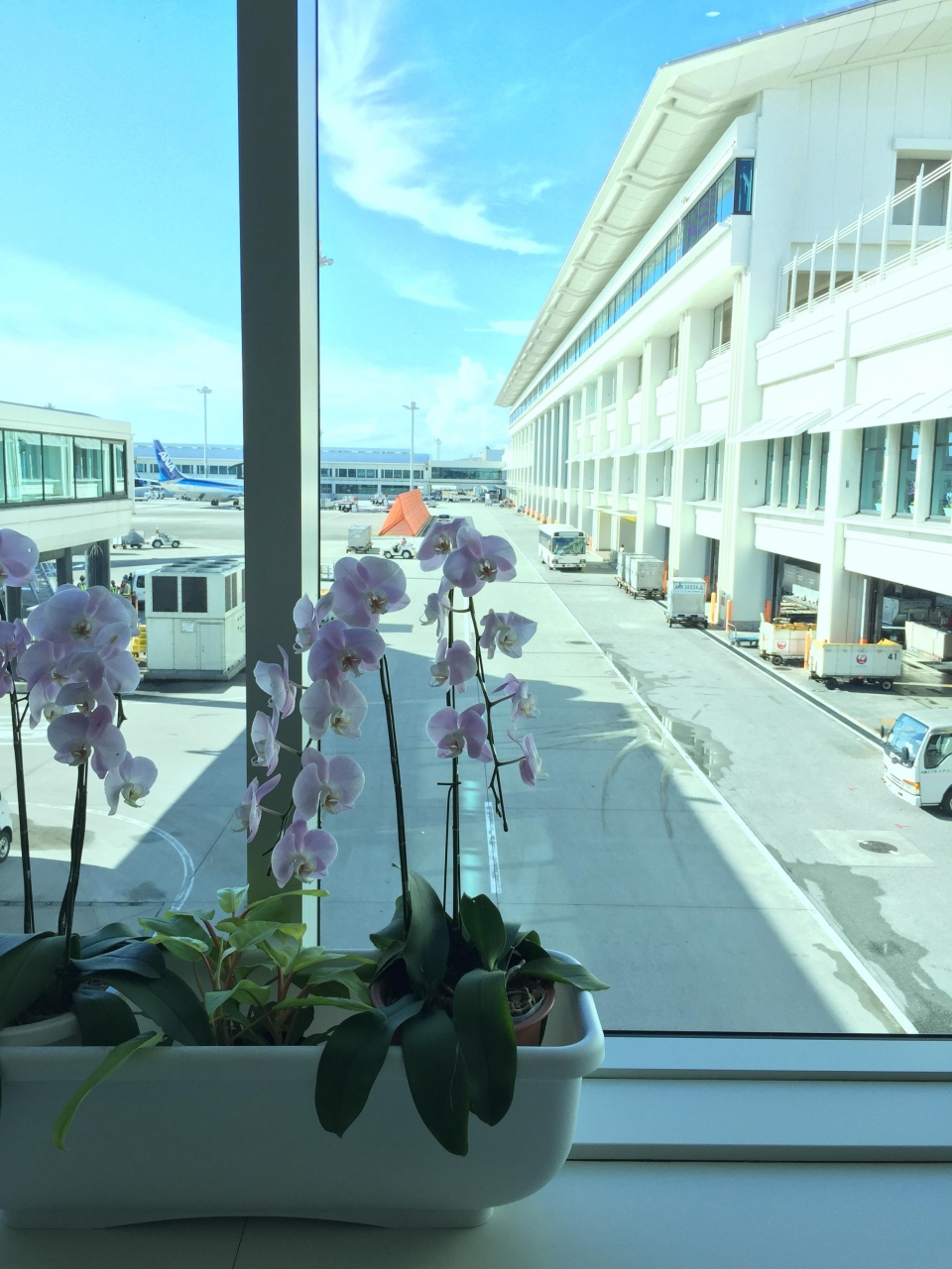 飛行機から出ると熱波が押し寄せてきますが、通路から見える空港建物は殆ど白一色で一見涼しく感じさせてくれます。通路の両側に置かれている南国の花も赤.白.黄色と華やかに咲いておりこれから始まる沖縄旅行への期待を高めてくれます。