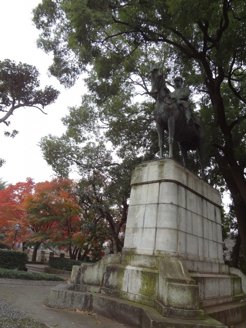 12月に九段下の駅を降りて近隣を散策すると、ところどころで木々が色づいた光景を目にします。靖国通り沿いにある騎馬像「大山巌像」も、写真を撮るアングルによっては、紅葉がとても良いアクセントになります。