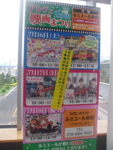 秋田駅のよりマイナーな側の東口に隣接する商業施設ですが、ここは平時はテーブルと椅子が並んだパブリックスペースになっていて、Wifiも対応しているので、PC使って時間を潰そうとアクセスしましたが、今回は日曜日の訪問ということもあって、中央の吹き抜け部分のこのスペースがイベント会場になっていて、そういう雰囲気ではありませんでした。休日は賑やかなこともありますので、事前にイベントの有無を確認の上アクセスされた方が良いかと思います。尚、ここの2Fにはルミエール秋田と呼ばれる映画館がありますが、7月には映画まつりとして無料で映画が観られる時があるそうです。これが凄い人気のようで、チケットはすぐになくなってしまうとのこと。映画目的の方は早めにチケットをゲットするようにして下さい。