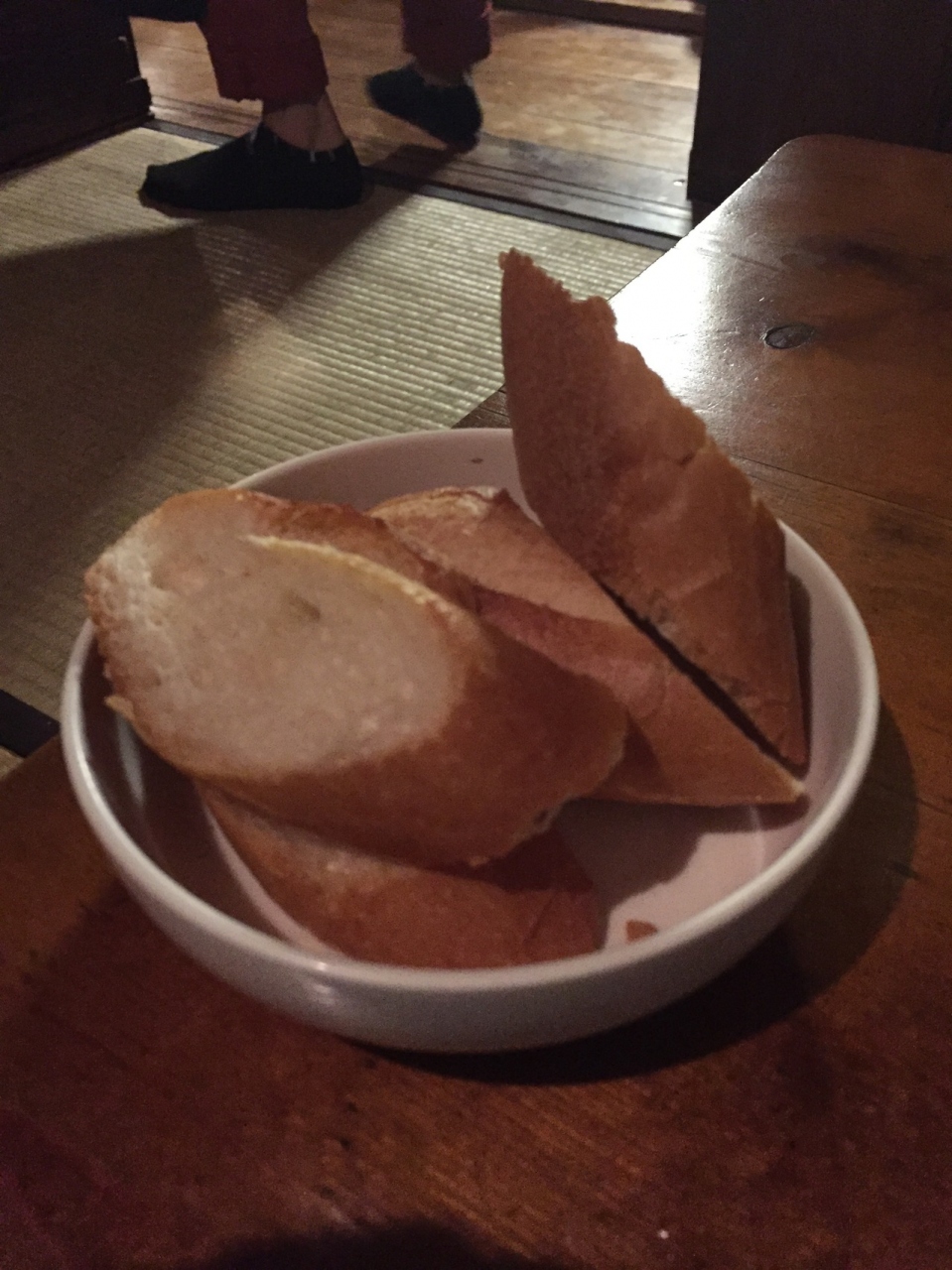 古民家を改装しているようで、1階はワインの立ち飲みバー(ほぼ満席)、2階がレストランです。と言っても、1階で靴を脱ぎ、男性はビニール袋に入れてあがります。