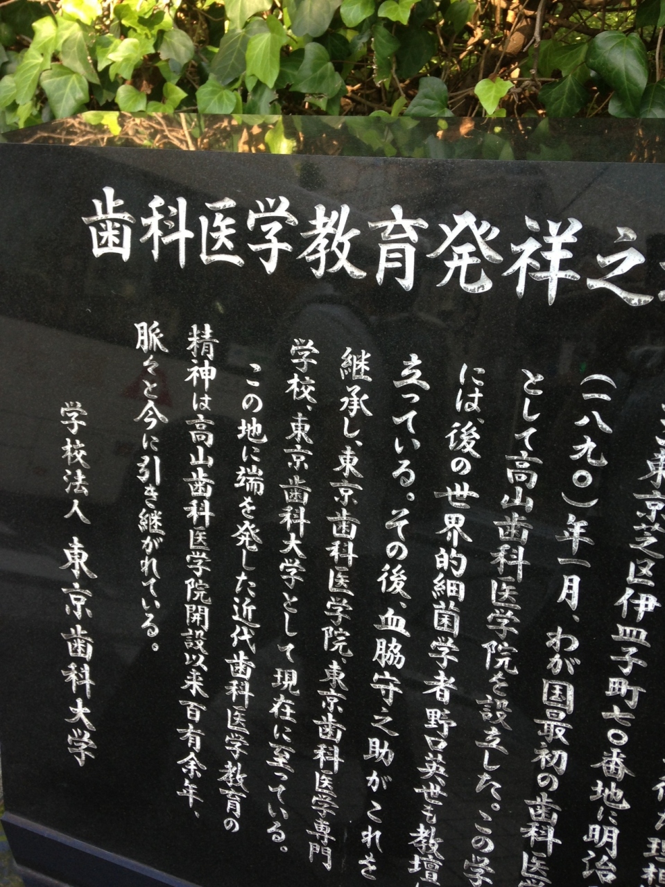 白金高輪はよく来ますが、いても泉岳寺ばかりが有名で日本人誰もが知っている赤穂浪士の討ち入りで有名ですが、魚藍坂から歩いて入皿坂のちょうど交差点に黒い大きな石碑があります。この地で日本で初の歯科大学が立った場所だそうです。何度も入皿坂も歩いてましたが、始めて気づきました。