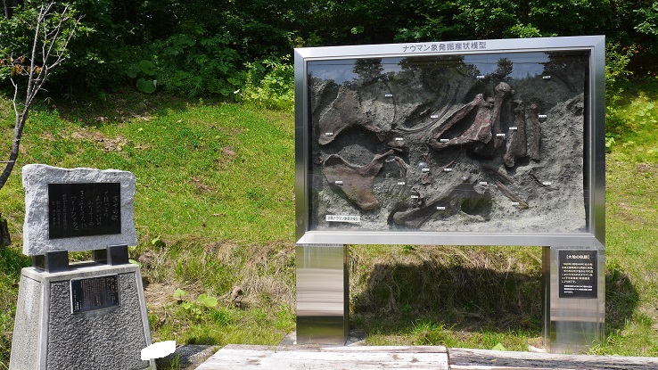 国道336号線から標識を頼りに忠類方面への農道を進んでいくと森の中にある。農道工事中に偶然発見したナウマン象化石。これを記念して記念碑や発掘産状のレプリカ模型がある。駐車場は道路を挟んだところにあり、意外と自動車が通行するので安全に気を付けて立ち寄りたい。