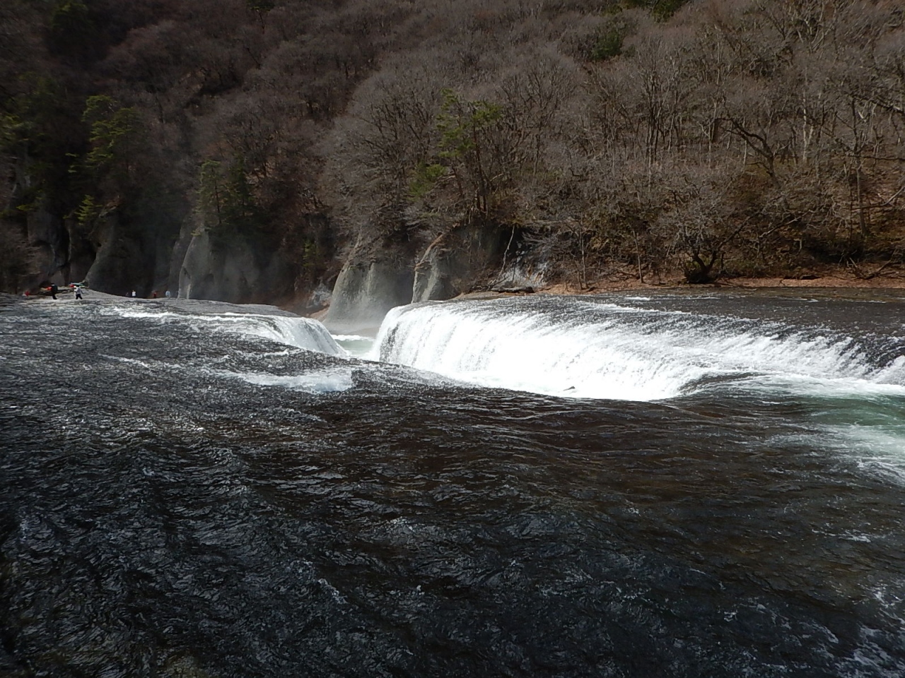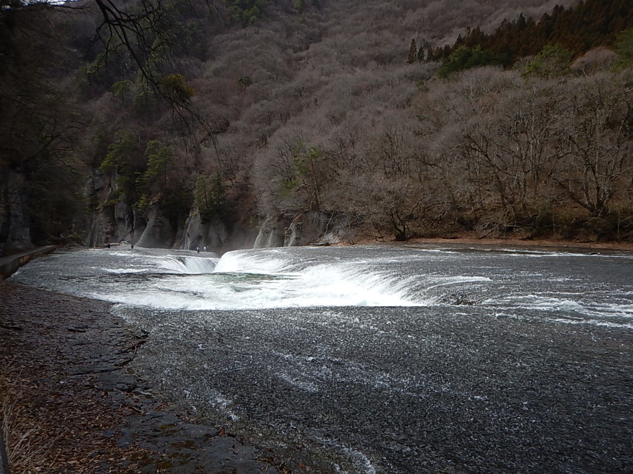 下流にある鱒飛の滝、上流の吹割の滝は遊歩道からさらに滝に近づくことができる。
