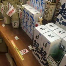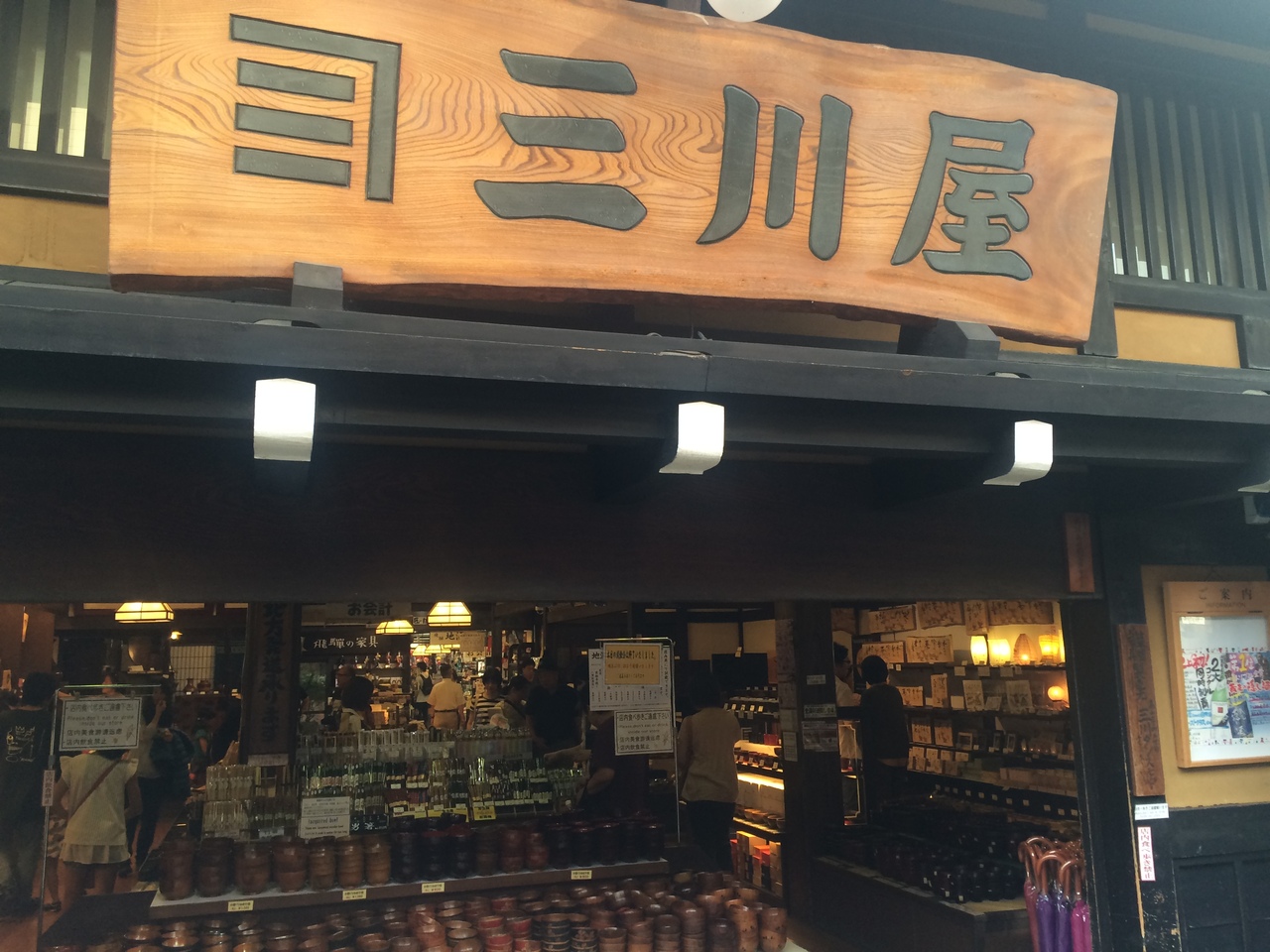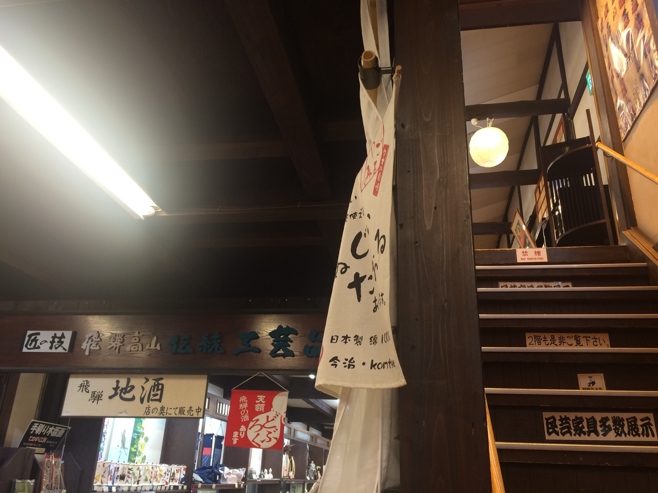 入り口上の屋号の看板が大きな板で雰囲気がある昔ながらの建物です。店内は細長い狭い空間に土産が並んでいて食べ物の他に民芸品も売っていて2階にも店舗があります。入り口付近にはお椀がたくさん置いてあり店の中程には地酒が置いてありました。
