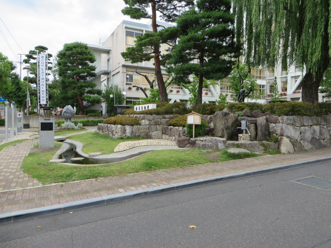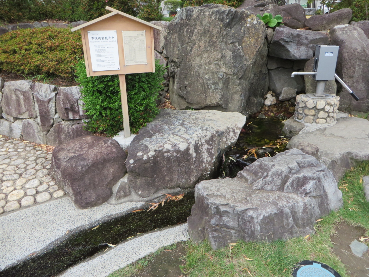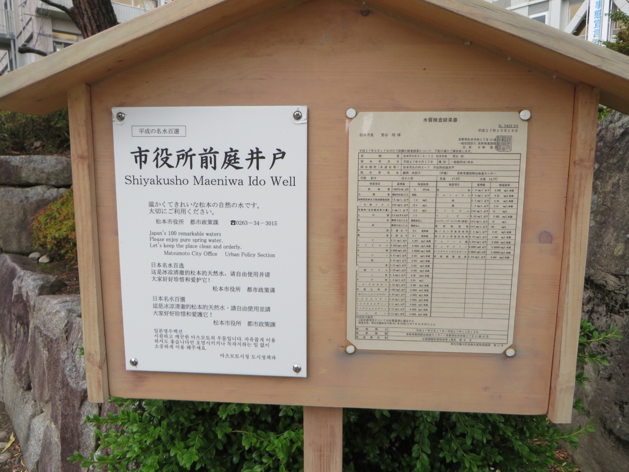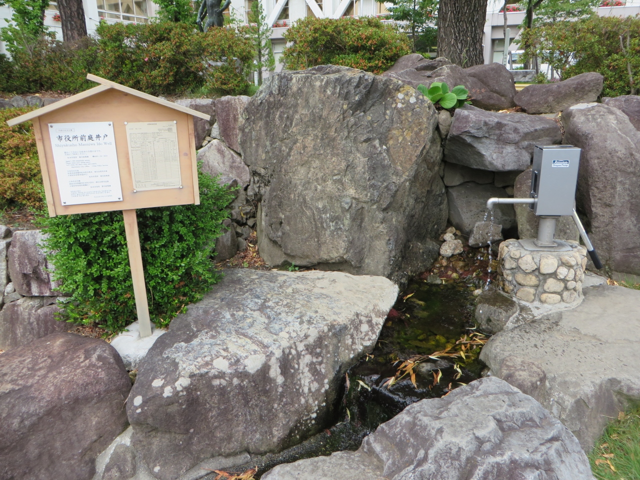 市役所前庭の改修に合わせ整備されたそうです。手押しポンプです。柄を4~5回上下に動かすと水が出てきます。他の井戸とはちょっと違いました。近くに松本市のマスコット「アルプちゃん」の石像がありました。飲める水です。