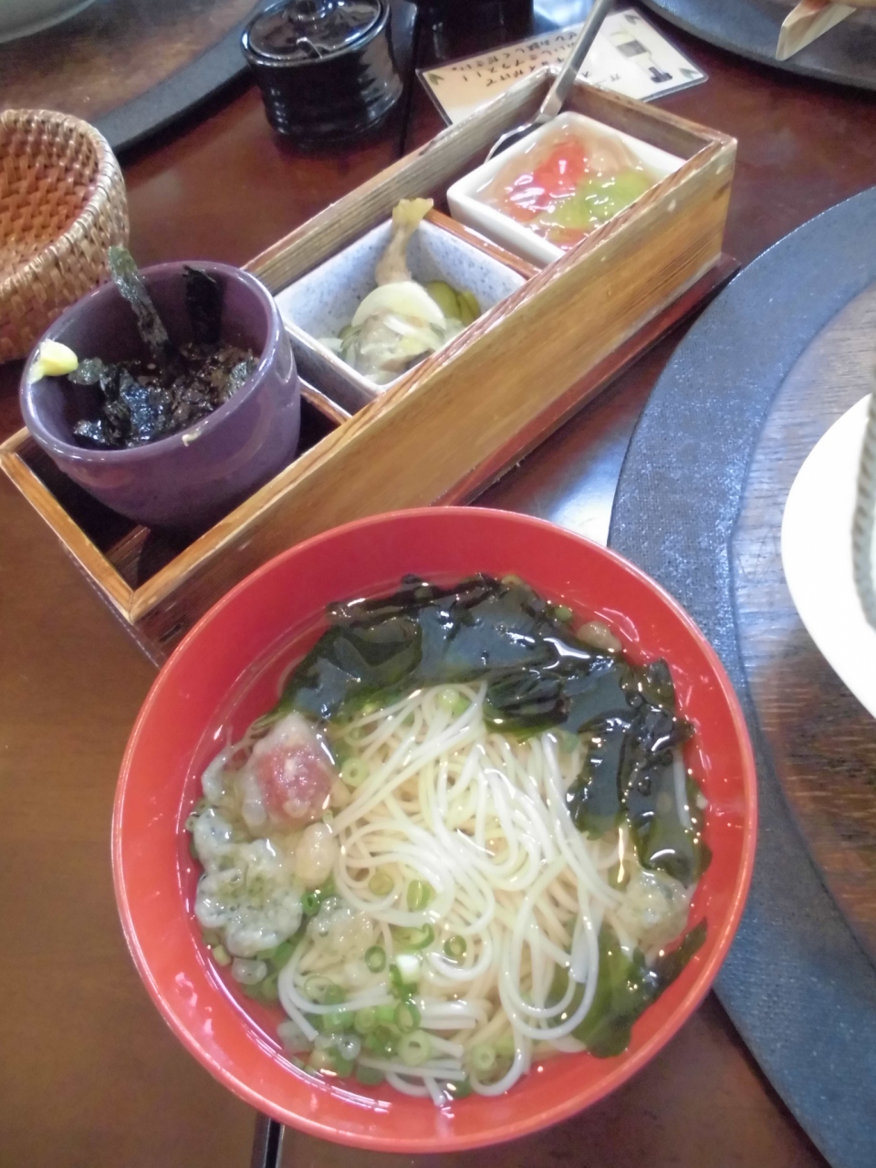 待ちに待ったお料理の味はとてもおいしく、人気の程が伺えました。ひしお丼のほか、にゅう麺のお吸い物、三つ仕切りの小鉢セットがついていて、この値段は大変お得だと思いました。