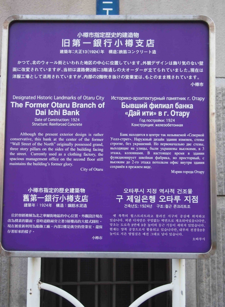 色内大通りと日銀通りの交差点のとても良いロケーションに建っているのが旧第一銀行 小樽支店です。この辺りが北のウォール街として発展と同時期に建てられた建物で重厚な鉄筋コンクリート造りの4階建てです。交差点に沿うようにきれいにラウンドされた曲線が優雅さも醸し出しています。