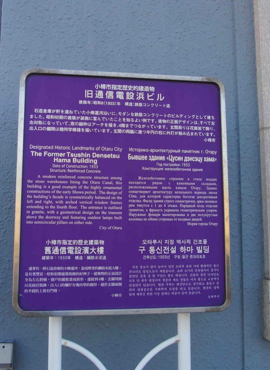 JR小樽駅・バスターミナルも近く散策エリアの小樽運河の始点近くに位置しています。小樽観光の中心地にありますが比較的近代的な建物で現在は中華料理店が入っている為か歴史的建造物としての注目度は低いようです。道路の反対側から鑑賞するとこの建物の端正さが分かると思います。細長い建物ですが鉄筋コンクリート4階建になっています。