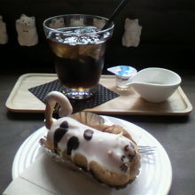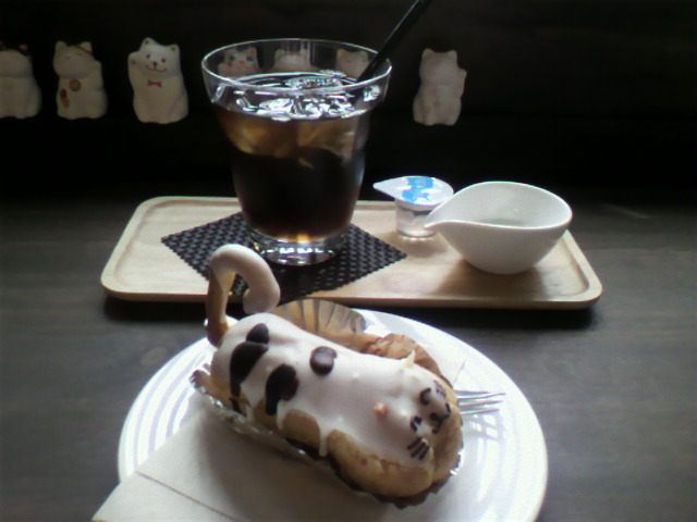 「白ぶちエクレア」とアイスティを注文。エクレアの中はホイップクリーム。カスタードが良かったなぁ…。招き猫クッキーを持ち帰り。アーモンドのきいたクッキーでした。