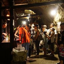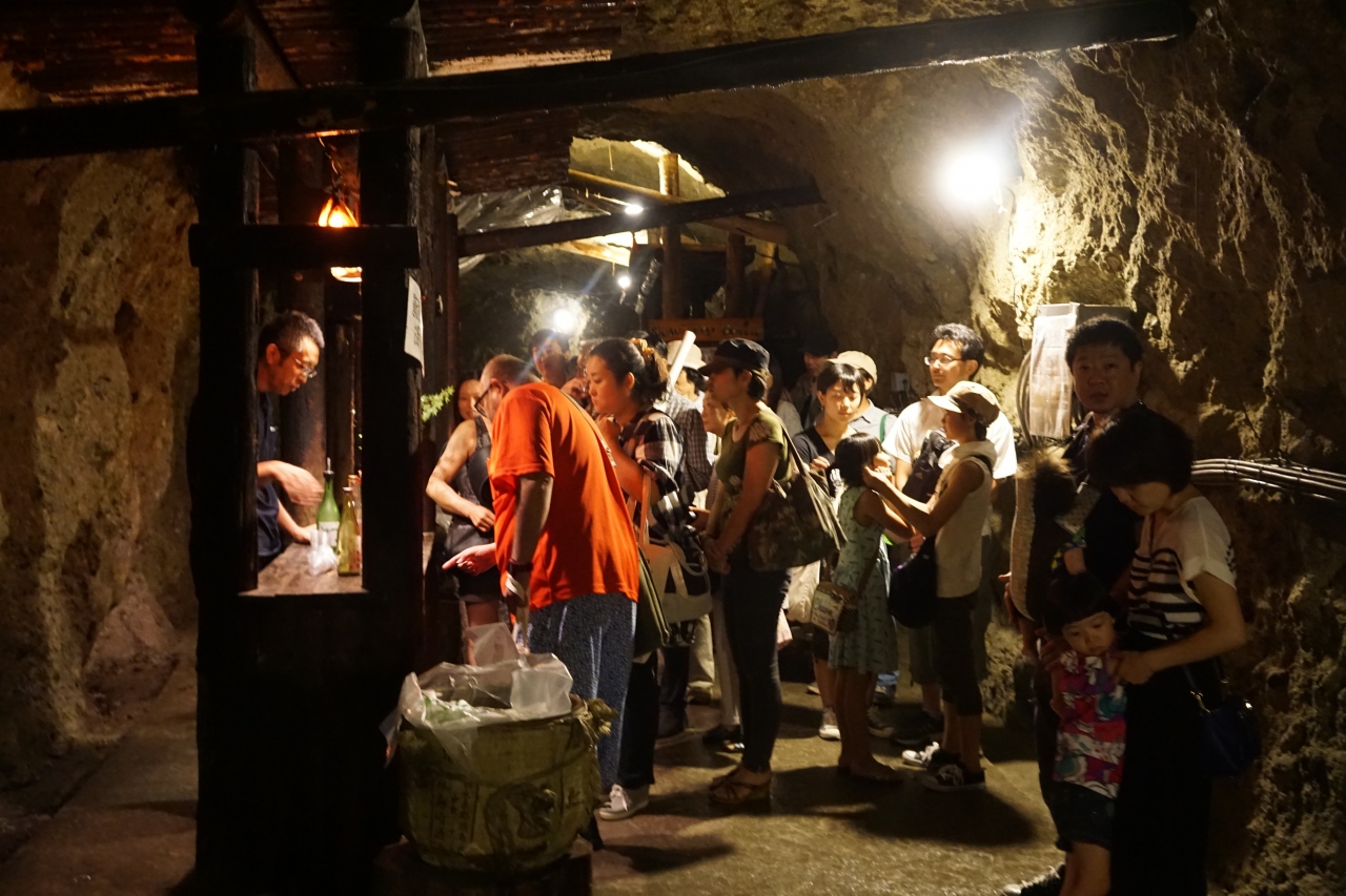 どうくつ酒蔵は、すっかり烏山の名物。山あげ祭りの期間中は、無料のシャトルバスが出ていたので、それを利用して訪ねました。戦時中は戦車の部品工場にするために掘られた洞窟。実際には製造されることはなかったようですが、それが戦後も残っていたのを島崎酒造本店が借り受けて、日本酒の熟成をし始めたのだそうです。