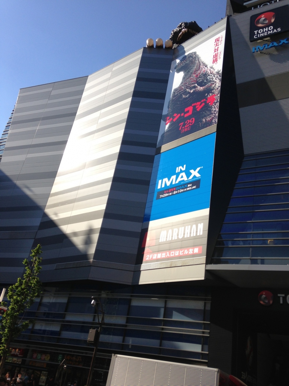歌舞伎町のコマ劇場の旧跡地に出来た東宝シネマズ新宿。上を見上げると有名になった新しいシンボルのゴジラヘッドが見えます。東宝シネマと言えば、ゴジラを思い浮かべる世代の人もたくさんいると思います。ゴジラの怖い感じがひしひし伝わる感じですね。