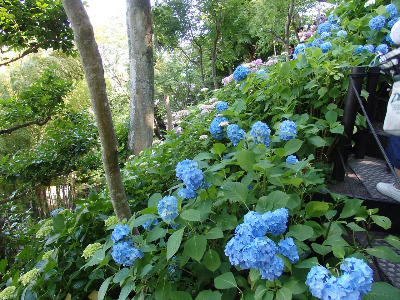 「コメント」伽藍は山門をくぐり石段を登ると地蔵堂、石段を登りきったところに右から地蔵堂、鐘楼、阿弥陀堂、観音堂(本堂)、経蔵がある。また左手奥には回遊式庭園があり、鎌倉市内を一望できる見晴台と散策路がある。散策路周辺にはアジサイが植えてあり、あじさい寺としても有名。今アジサイ真っ盛り。相変わらず人が多い。
