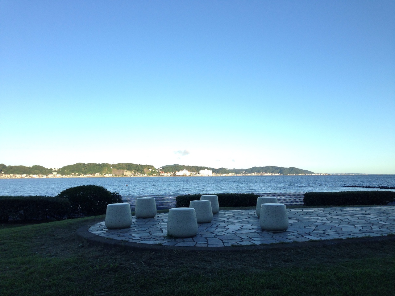 江ノ電の長谷駅から近い辺りにあります。小さなスペースですが こんもりとした丘の上に石の椅子が並び海が見渡せる気持ちの良い場所。日が沈む頃で こちらは日陰になっていて涼しい中、逗子方面が太陽を浴び輝いている景色が見られました。