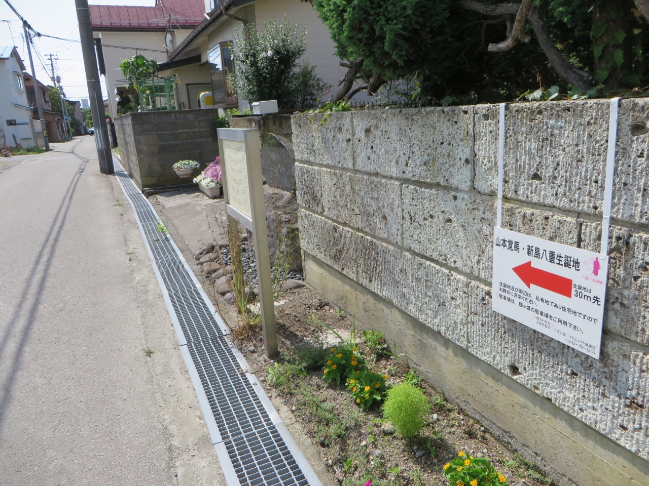 若松商業高校の裏手と思います。一般の民家の入口門横に生誕石碑、塀の前に説明板がありました。そして生誕地は30メートル先と矢印がありました。実際の生誕地は先のようです。歩いて行くと今は駐車場になっており二人の功績が詳しく書かれた説明板がありました。なお、民家の塀の前にある説明板は学校法人同志社(1989年除幕)、駐車場にある説明板は会津若松市とありこちらは大河ドラマの後に立ったようです。お城の西側直ぐです。是非寄って行って下さい。