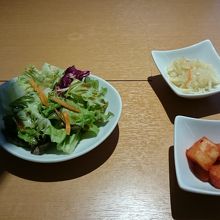 サラダ、キムチ、石釜ごはんがセットになっており、石釜ごはんのおこげは最後にスープで浸して食べられます。