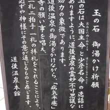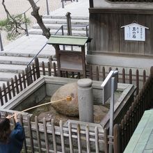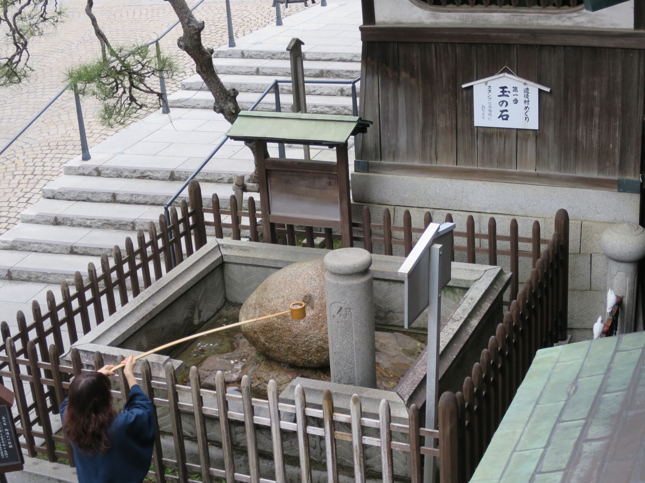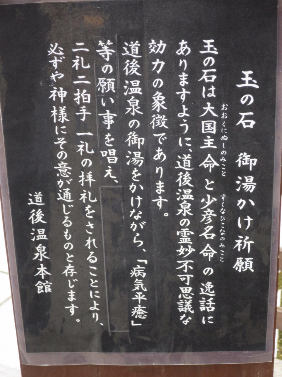 道後温泉本館の左手奥に本館に寄り添う形で柵に囲われた玉の石はあります。大国主の命が少彦名命の病気を道後の湯で治したと言う伝説がある丸っこい石で、柄杓のお湯を汲んで岩に掛けることで願掛けをすることができます。思った程、人はおらず並ぶっことはありません。