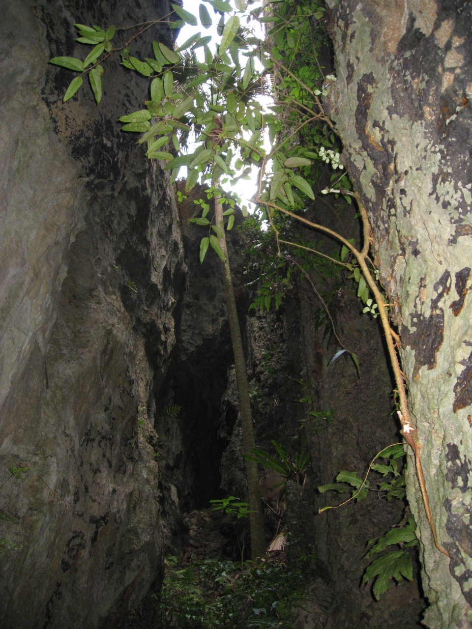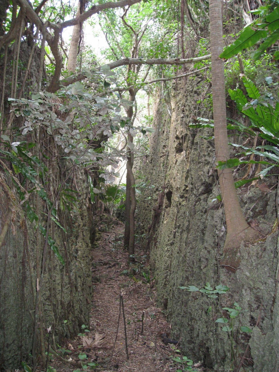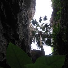 入口に説明書きの看板が立てられており、入場無料です。地殻変動で岩が割かれて小路のようになっており、散策可能ですが、ジャングルの中であるため野生の生物(凶暴な動物はいませんが)出てきそうで多少スリルがありました。岩の裂け目をダイトウビロウの木がまっすぐに伸びている姿を写真に収めました。
