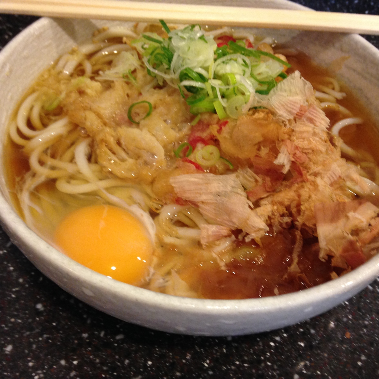 全メニュー30円プラスで温から冷にできました。冷やし天玉はうどんにかき揚げと生卵が乗っていました。饂飩に生卵はイマイチでした。冷たい汁のため半熟にもならず…かき揚げに添えられていた紅ショウガが意外とうどんに合いました。
