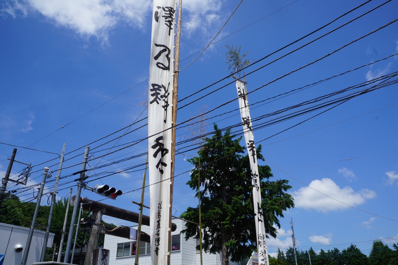 烏山の山あげ祭りは、この八雲神社の祭りだということで、祭りの期間中に訪ねてみました。ただ、神輿はもう出ているので、境内はがらんとしていて、祭りという感じはなし。入口に、二本の幟がひらめいていて、これが祭り期間中であることを示していました。最終日の夜に神輿が帰ってくる時が、もう一つの祭りの見どころだということでしたが、それはあまりにも遅い時間だし、そこまで見届けることはできませんでした。