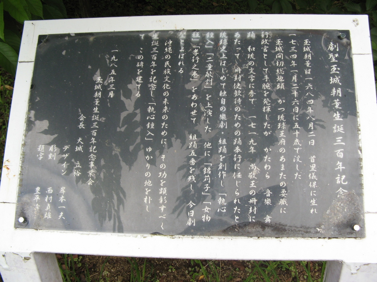 玉城朝薫は、琉球王朝が中国皇帝の使者である冊封使を歓待するために演じられた歌舞劇である“組踊”の創始者で、“劇聖”と称されています。組踊は1972年に国の重要無形文化財に指定、さらに、2010年にはユネスコの無形文化遺産【世界遺産】に登録されています。記念碑には、玉城朝薫の代表的な作品である“執心鐘入”や“二童敵討”の場面が描かれています。