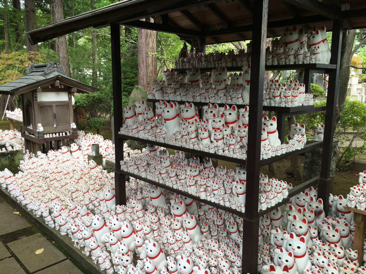 綺麗に手入れされた参道を歩いていると、清々しい気持ちになるから不思議。社務所に行って自分用と友人用に招き猫を購入し、招猫殿へ。ズラリと大小様々の招き猫が奉納されている様は圧巻です。平日だったので人もまばらだったので、のんびり散策できました。