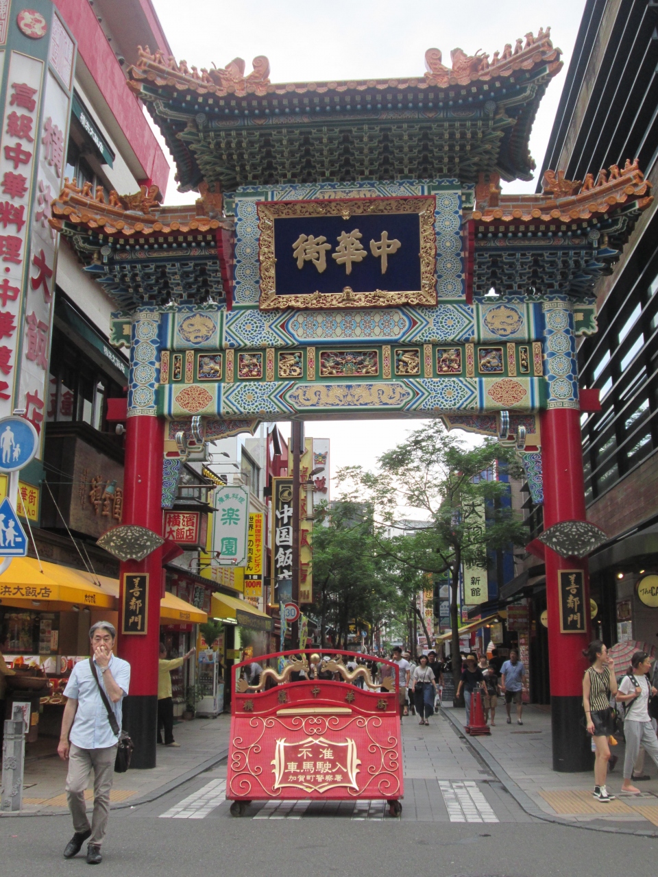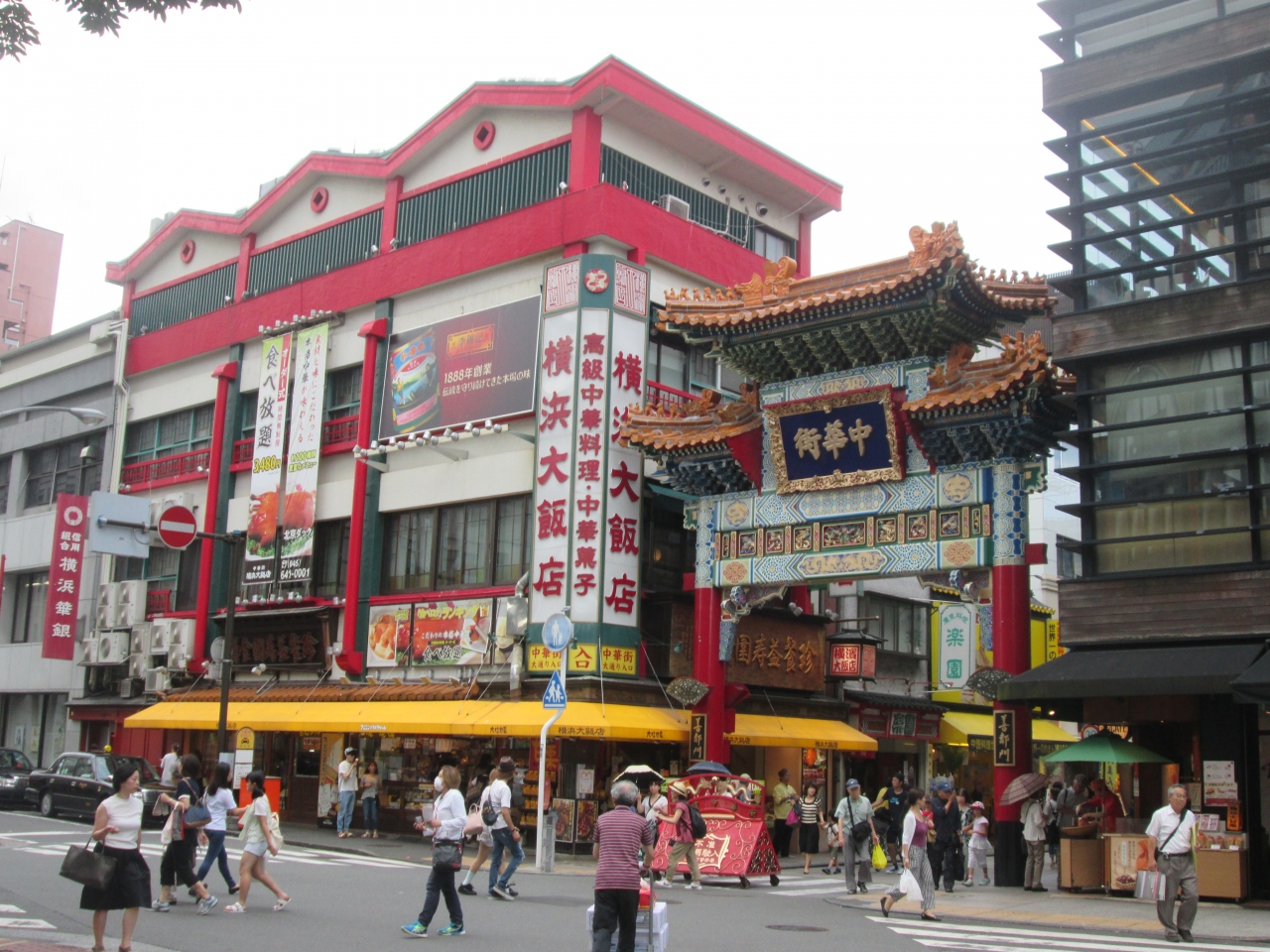 横浜中華街のメインストリートである中華街大通りの入口にあります、ここは北門通り、西門通り、長安道が交差する中華街の中心でもあります、他の門より規模が大きいので見応えがあります、門に隣接して横浜大飯店など大きな中華料理店があります、周辺には観光客が多くいて賑わっています。