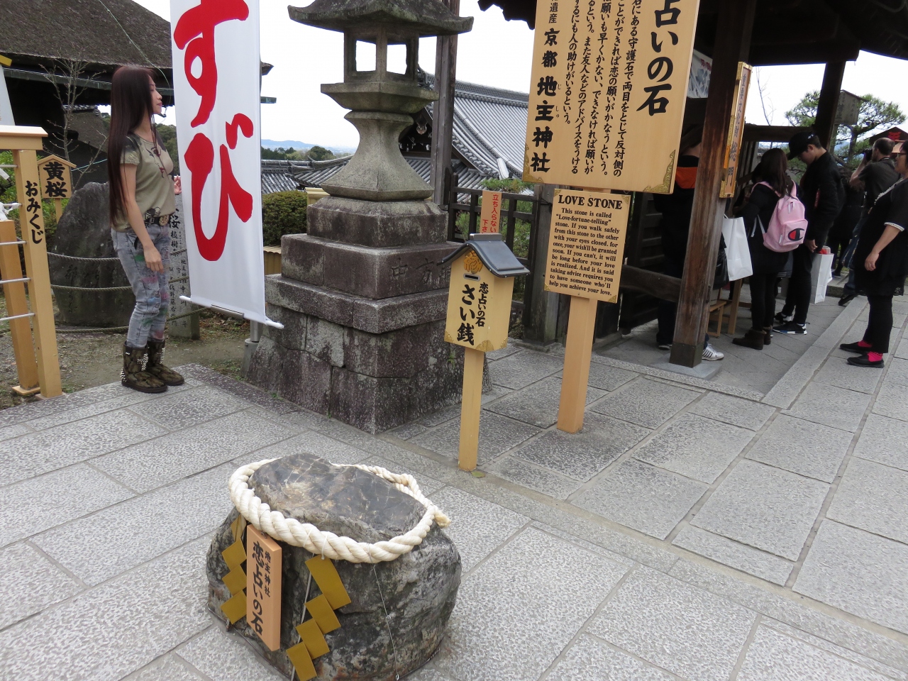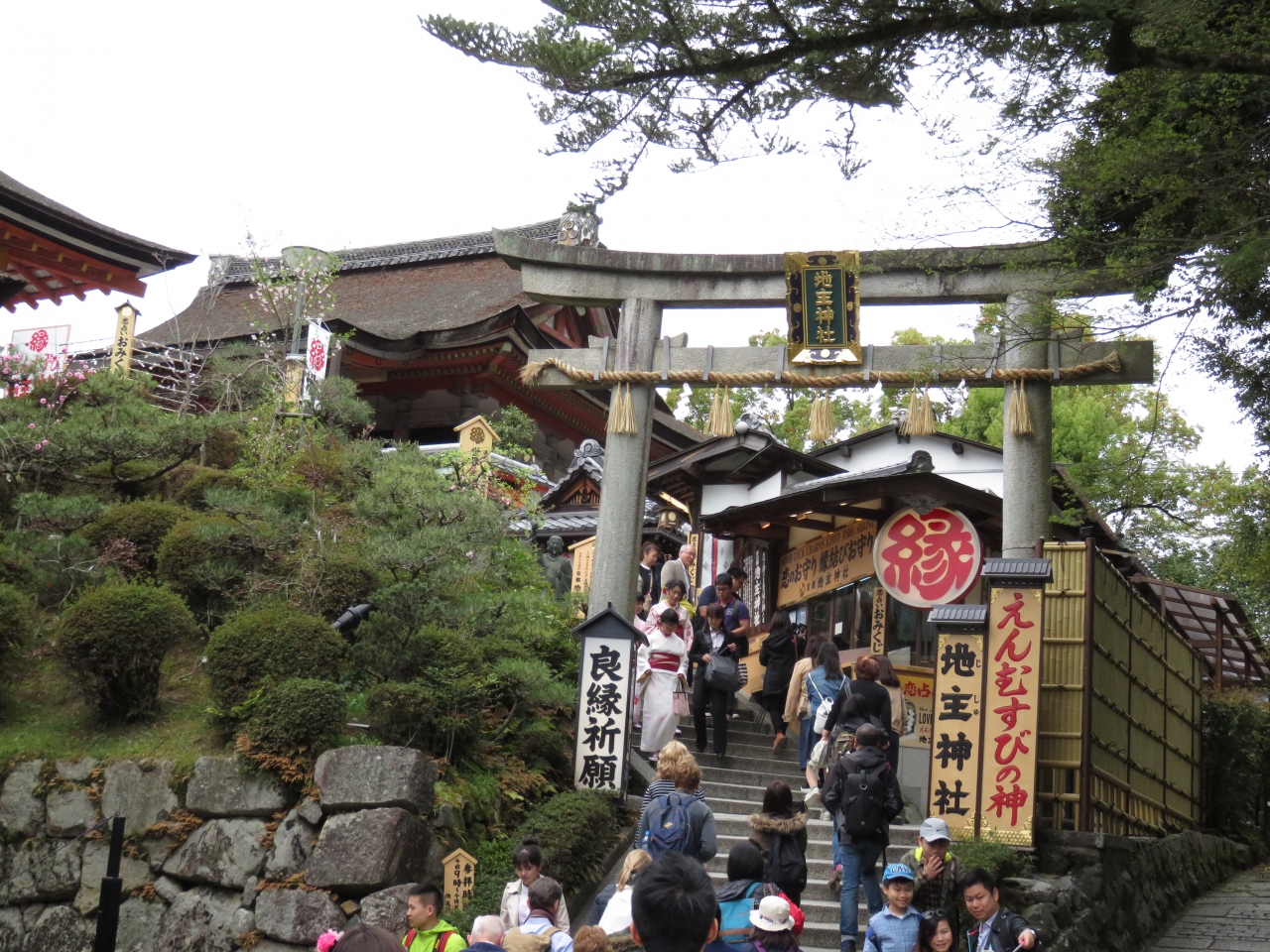 縁結びの神様としてよくテレビなどで紹介される清水寺の裏にある地主神社。この日も大勢の若い女性たちで境内は大混雑でした。願いが叶うと言われる石の周りにも人だかりが。目を閉じて進みこの石にたどり着けば恋愛成就?