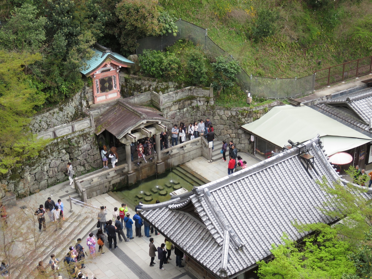 この日は久しぶりに拝観料を支払って清水寺の舞台に立ちました。舞台の上も観光客で大混雑。特に外国人観光客が多いように見受けられる。今回のお目当ては桜ですが、下を見たところ音羽の滝が見えました。今日も大行列でした。