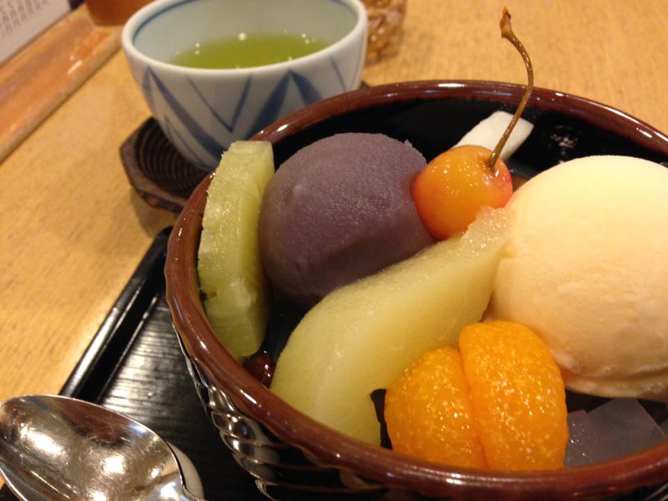 注文したのは「クリームあんみつ」。甘すぎない蜜、しっとりとしたこし餡、歯ごたえのある寒天、口に馴染むアイスクリームと果物。