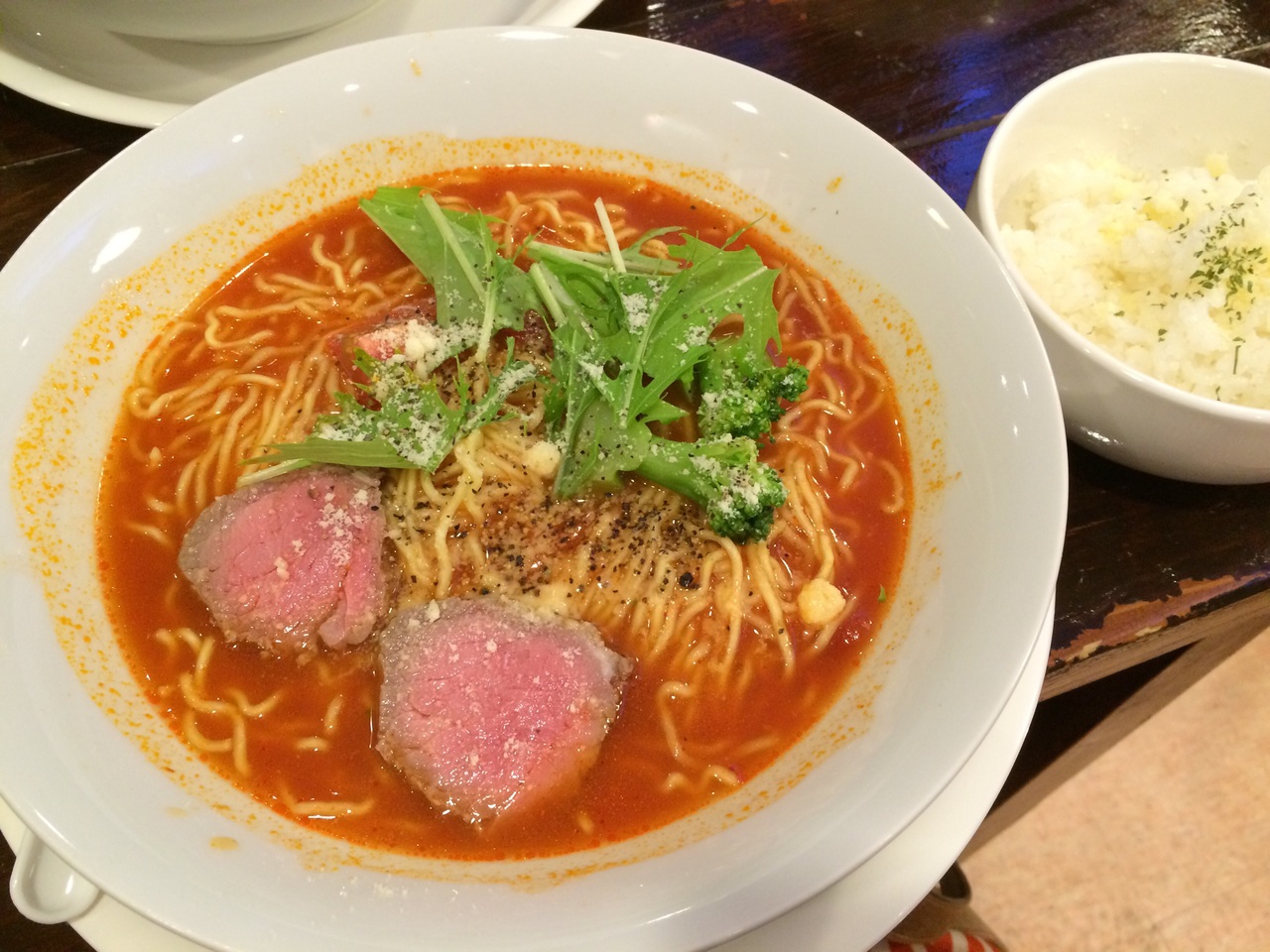 トマトスープにラーメンの麺、結構合っていて美味しかったです。