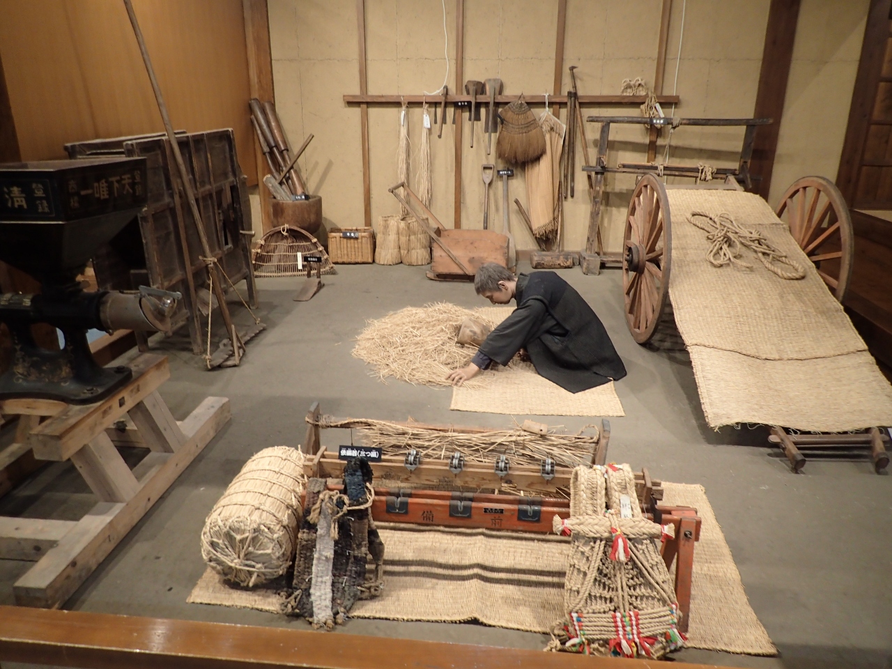 山居倉庫の一番奥の棟にあります。展示物は資料、農業用具、農家の生活、物流などが分かり易く展示されており、勉強になりました。米俵を5俵担いで運んでいる女性の等身大の展示物が当時の運搬機械がない時代の厳しい状況として印象深い。