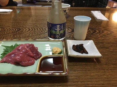 注文したのは、ざるそば、馬刺し、そばがきの天婦羅のセット。そして、地酒です。最初に地酒を持ってきてくれたんですが、その時にセットの馬刺しだけを先に出してくれるなど、とても気の利いた接客でした。