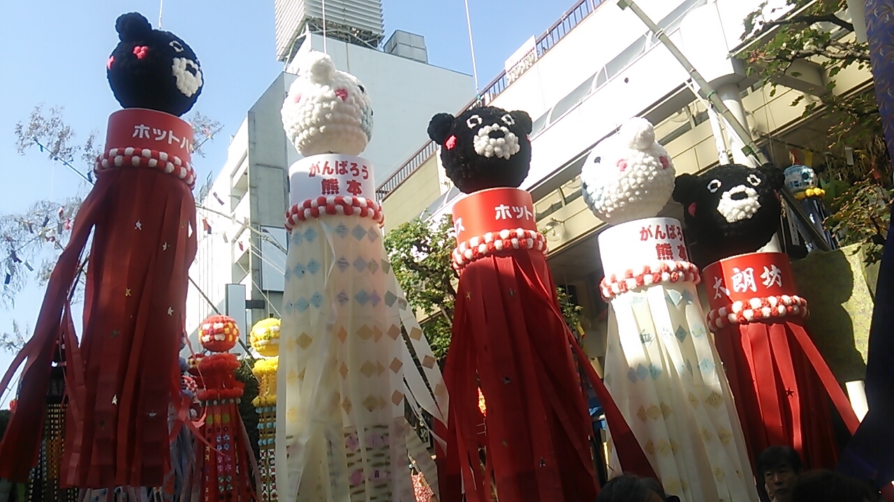 2016年8月6日現在、上杉山通小学校、くまモンのイラストが描かれた熊本応援七夕、金賞受賞作品の吹き流し等が飾られていました