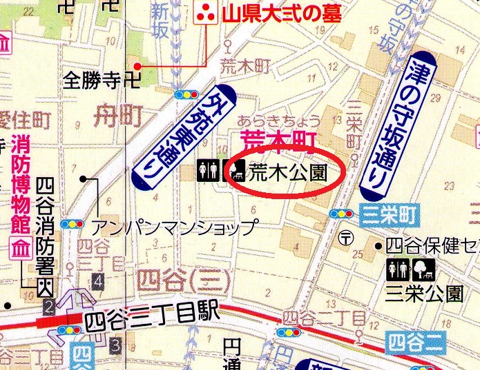荒木公園は、四谷三丁目から靖国通りに抜ける外苑東通りの東側にあるこじんまりとした公園です。